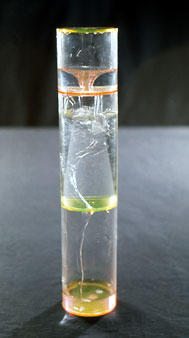 Transparent cylinder divided into 3 sections connected by a series of random holes through which air and water move.