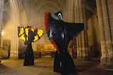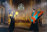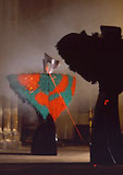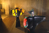 Two mixed media performing sculptures enact a computer controlled 6 minute drama which includes movement, song, the transformation of sound to light, and a laser display.