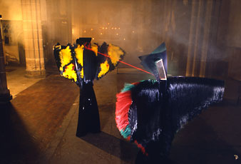 Two mixed media performing sculptures enact a computer controlled 6 minute drama which includes movement, song, the transformation of sound to light, and a laser display.