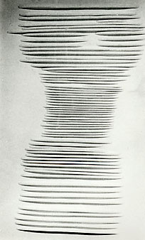 Cuttings are negative reliefs. The slices of saw-blade cuts made in a clear Perspex sheet are perceived as solid relief casting shadows on the back surface of the sheet, whereas the solid uncut area of the sheet is perceived as empty. The original concern of these early works was the interchangeability of opposites, i.e. that negative and positive were so close as to be indistinguishable.