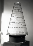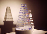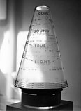 Letraset on perspex cone, motorised turntable.Text collaboration between Liliane Lijn and Nazli Nour.