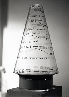 Letraset on perspex cone, motorised turntable.Text collaboration between Liliane Lijn and Nazli Nour.
