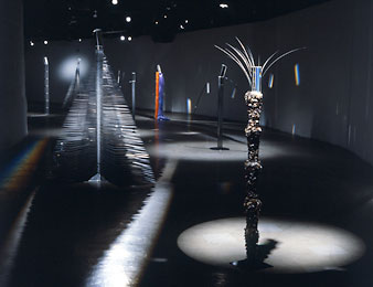 Anodised aluminium angle, feather dusters, piano wire, glass beads, optical glass prism.