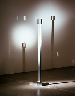 I wanted to make human figures stripped down to the essential but also bring to them something new. I used military and industrial materials to make them icons of the central power of our society and gave them heads which reflect and refract light emitting beams of colour.