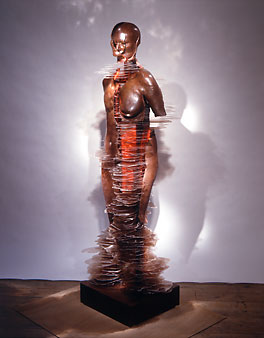 Here the bronze body seems heavy and solid. The patina is leatherlike. Skin worn like the ancient Aztec sacrifices of the Corn Goddess and inside fire or pain.