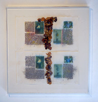 Watercolour and dried flowers on printed Tosa Shoji paper pages from Her Mother’s Voice.