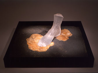 Patinated bronze, cast glass, perspex case, volcanic sand (Ayres Rock stone cast and artist’s foot).