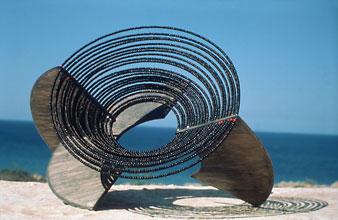 The studies for Heads gradually became Head-dresses. These are sculptures to wear, head ornaments and symbols of the head. In particular, I play with geometry, collapsing and folding circular planes or segments of rings, using piano wire and beads as a flexible mobile extension of the plywood shapes. I use beads for colour. The multiplicity and repetition of identical elements interest me because I see this as a mirroring of atomic structures and their interplay.