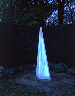 The inner space of the sculpture gains vitality as the outer lineaments of form dissolve with the approach of night. The central concept is of light held within matter.