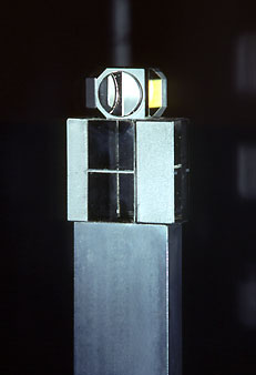 Stove-enamelled black aluminium base, chemi-blacked steel and optical glass prisms.