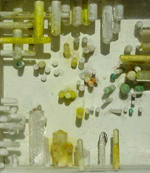 Drilled painted Perspex, analine dyes.