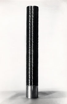 The oscillating line of reflected light on each cylinder acts as a system of signals that describes spatial changes occurring on the surface of the cylinder.
