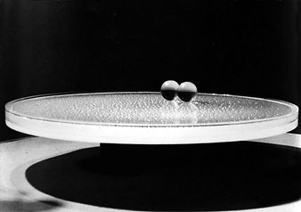The movement of the balls on the surface of the disc is governed by the laws of momentum, as well as centrifugal force and the pull of gravity induced by the concavity of the disc. The balls also act as moving magnifying lenses, bringing to life now one area of the disc, now another, with a strange lunar landscape of reflections and shadows. Liquid Reflections is my attempt to contemplate the universe on an intimate scale.