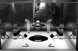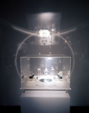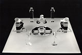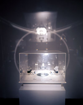 Laminated perspex base with light box underneath, mirror set into centre; perspex and optical glass prism figures.