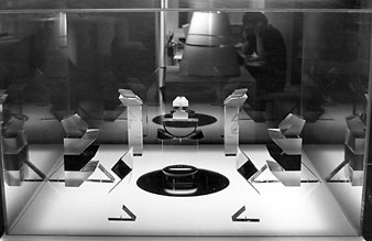 Laminated perspex base with light box underneath, mirror set into centre; perspex and optical glass prism figures.