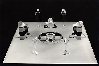 Laminated perspex base with light box underneath, mirror set into centre; perspex and optical glass prism figures.