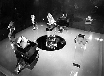 Laminated perspex base with light box underneath, mirror set into centre; perspex and optical glass prism figures.