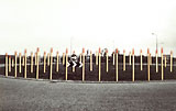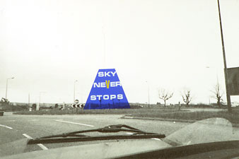 All the proposals I made for roundabout sculptures related to what could be seen driving along roads and motorways. I wanted to use the iconography of the road, widening meaning through change of use and contradiction. Thus in Sky Never Stops there is a concrete cone traffic cones with the word stop used in relation to the word never.