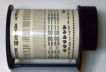 Letraset on painted metal drum, plastic, painted metal, motor. Words taken from a poem of Nazli Nour.