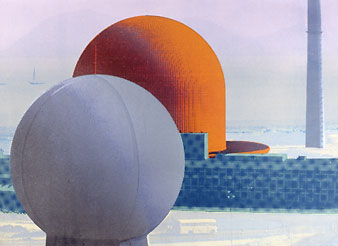 The image is of the Trombay nuclear power station which made headlines that year due to India exploding its first nuclear test bomb. I had cut the photo from the newspaper about a year before the uproar, intrigued by the forms of the power station. It is a sequel to my set of Industrial Landscapes.