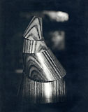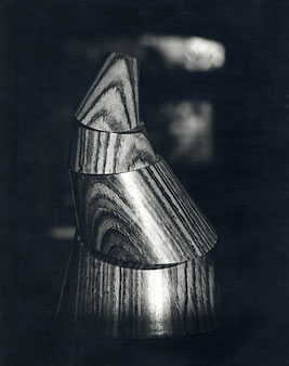 A solid cone cut into elliptical sections. Each section pivots around the next one so that the whole cone is articulated on elliptical lines. This is particularly interesting because the formal geometrical shape metamorphoses into a very sensual organic succession of shapes.