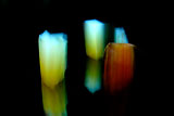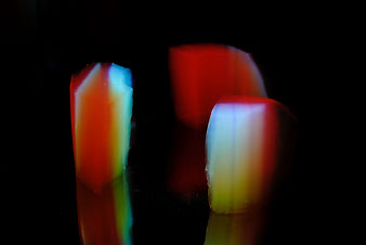 Aerogel fragmented ring on bronze mirror in Perspex case, perlescent metallic coated square column housing dvd player, projector