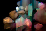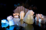 Aerogel Fragments of cone and disc on grey mirror in Perspex case, perlescent metallic coated square column housing dvd player, projector