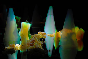 Aerogel and rosin on mirror in Perspex case, perlescent metallic coated square column housing dvd player, projector
