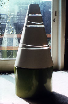 One in a series of 5 white fibreglass cones intersected by 5 elliptical layers of perspex of varied thickness, motorised turntable.