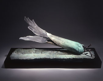 Patinated bronze, cast glass (Ayres Rock Gum tree bark cast, artist’s arm and hand)