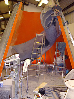 The slide, in separate sections, was then fixed to the inside of the main cone mould. In order to reach the final cast, 3 separate molds were taken of each section. Each casting of a new mold allowed us to improve the final form.
