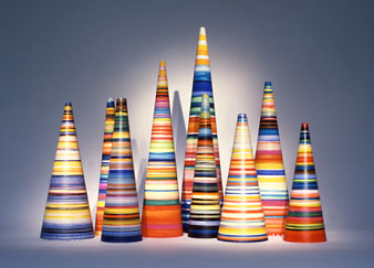 I am interested in the effect of multiple layers of colour laid on the cone as it revolves at a high speed. Finished and taken off their turntable, the cones still appear to be spinning. One is seeing the traces of motion on their surface.