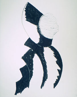 The idea of using beads to mask the head, thus hiding the prism which directs the laser beam from inside the head, was already in the early drawn studies and even earlier in the beaded sculpture Woman of War Head. When it came to making the sculpture, I forgot the bead mask until I realised that it was necessary to complete the head.