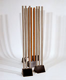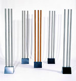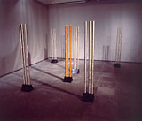 Five pieces composed of 3 aluminium tubes 152 cm high x 4 cm diameter wound with 0.012” nickel wire, in two different spatial arrangements on base / turntable; one 3 column piece of same dimensions is wound with 0.018” copper wire.