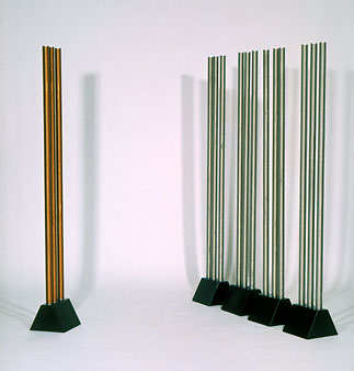Five pieces composed of 3 aluminium tubes 152 cm high x 4 cm diameter wound with 0.012” nickel wire, in two different spatial arrangements on base / turntable; one 3 column piece of same dimensions is wound with 0.018” copper wire.