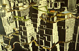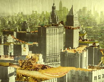 A set of four collages in which I visualised transforming the top levels of the New York skyscrapers into fantastic walkways spanning the island of Manhattan. I envisaged using film, holography, and giant installations to create fantasies of beaches and jungles.