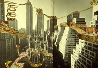 Collaged newspaper / magazine cuttings mounted on coloured card.