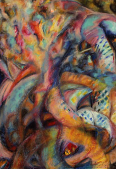 Three oil pastels which take an image of the Bride and transform it into the Medusa.