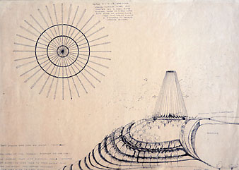 Made of a succession of flaps or wings which would catch the wind, these wings were meant to have a number of slits shaped in different ways so that as the wind passes through them, the whole sculpture would emit sounds. The idea being to provide a small town with energy on two levels: practical energy for physical needs and lyrical or spiritual energy for psychic needs.